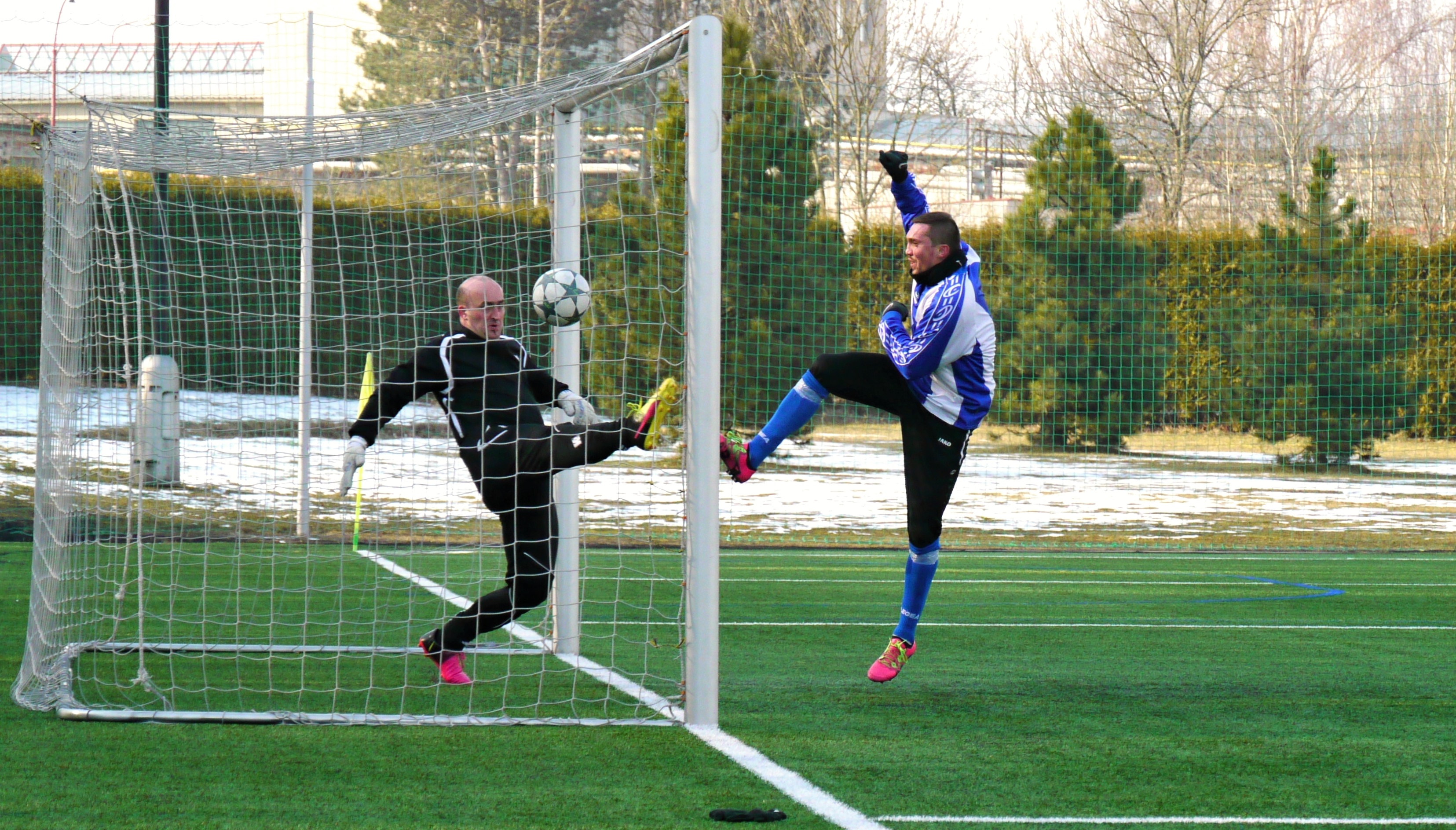 Souboj legend: Dobrušský brankář Jaroslav Klofanda s jaroměřským kanonýrem Martinem Škodou. Foto: Václav Mlejnek.