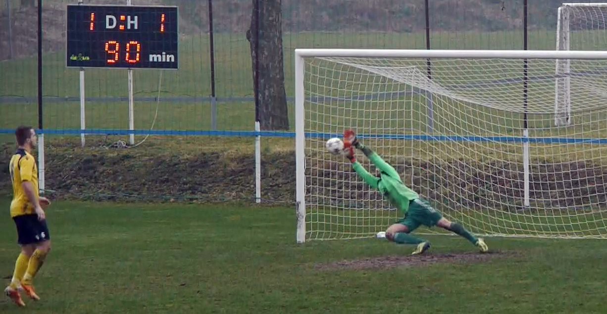 Michal Ondráček vyráží první penaltu v závěrečném rozstřelu. Foto z videa. Klubová fotogalerie soupeře k tomuto zápasu zde, autor Zdeněk Mudroch.