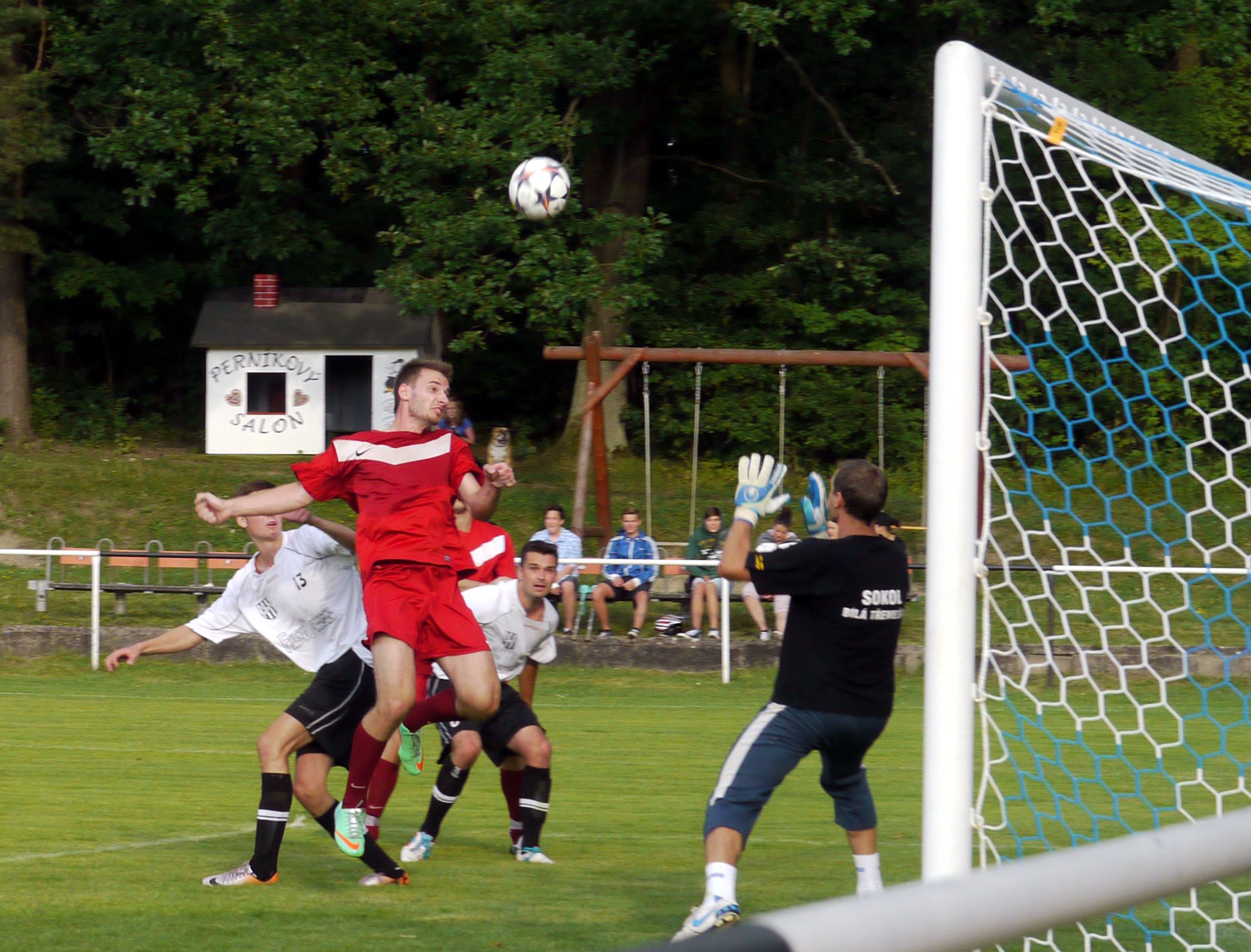 Martin Čenovský testuje brankáře Třemešné před svou trojnásobnou kanonádou.