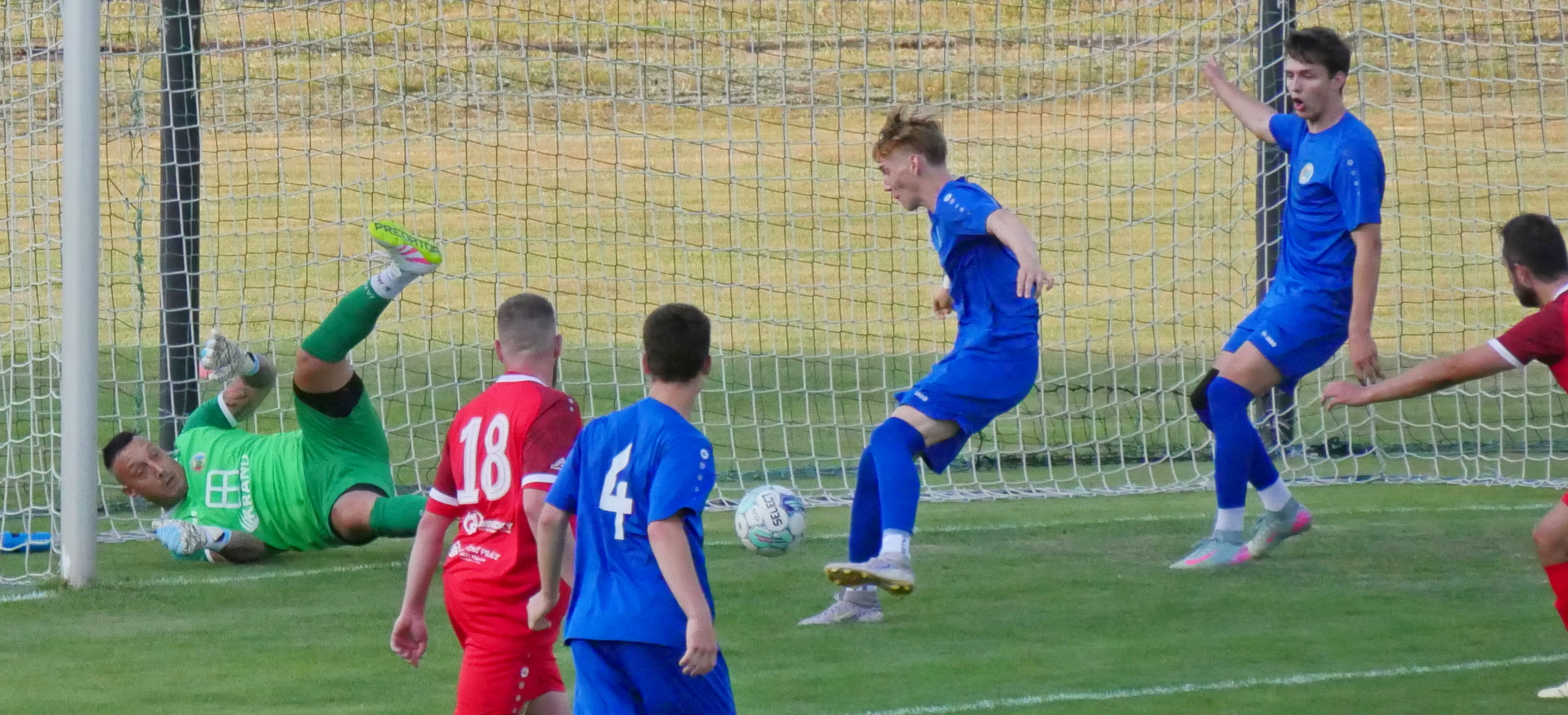 Gól ve 28. minutě. František Hemelík dvakrát dorážel míč do úpické brány, postranní rozhodčí však signalizoval, že brankovou čáru přešla už první střela od Jiřího Podolníka. Jaroměřští hráči v modrých dresech. Foto: Václav Mlejnek
